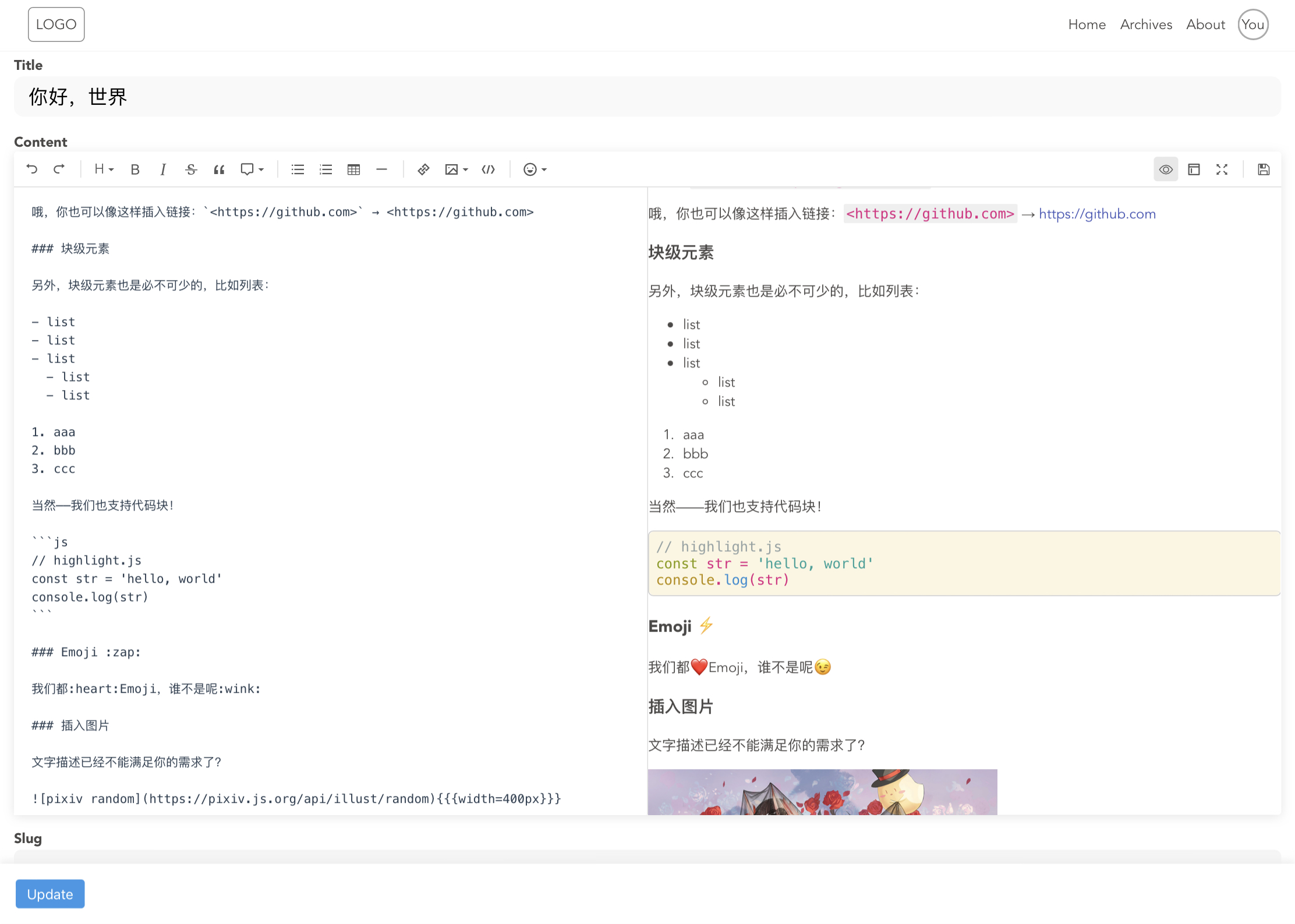 BlogNow 内置了非常强大的 markdown 编辑器,你可以点击按钮插入元素,然后实时预览你所写的内容。