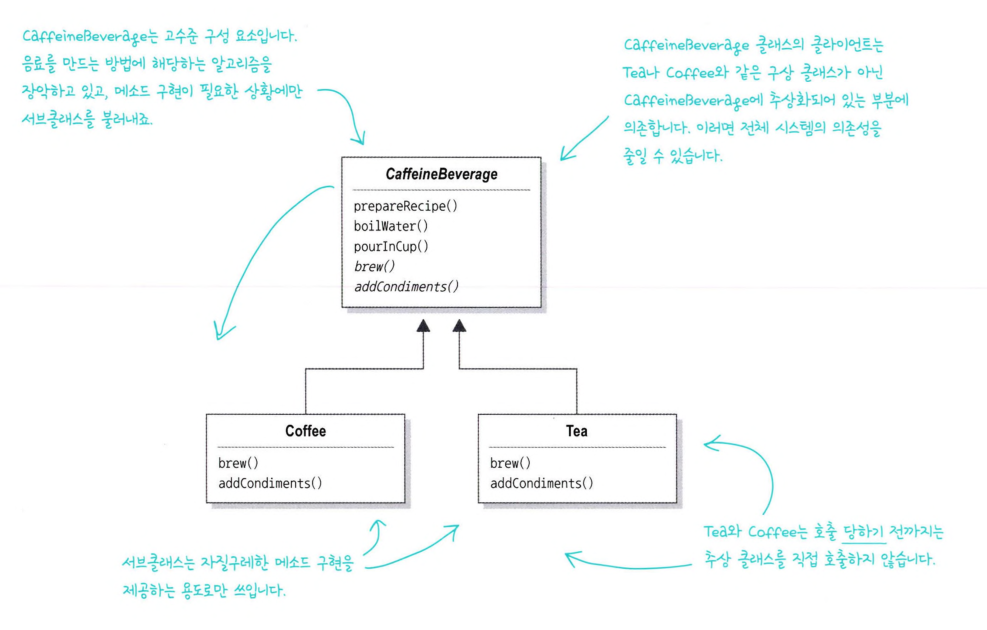 }위와 같이 할리우드 법칙을 위배하게 되면 저수준 구성요소(Tea)와 고수준 구성요소(CaffeineBeverage) 사이에 순환 의존성이 생길 수 있다