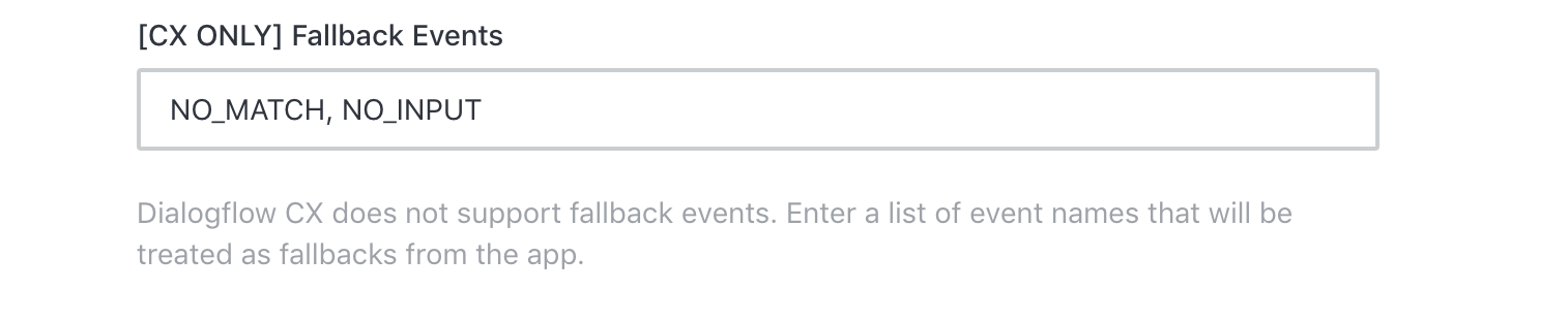Also..... is this a typo? Not sure it makes sense to have this labeled [CX ONLY] and to suggest that it's not for CX.... :-) Dialogflow CX does not use fallback events. This setting lists events that will be treated AS fallbacks by our Apps.Dialogflow. I can change the description and label to make this more clear. |