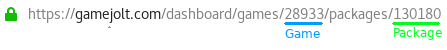 The game ID and package ID are available in the url of the manage game package page, for example: