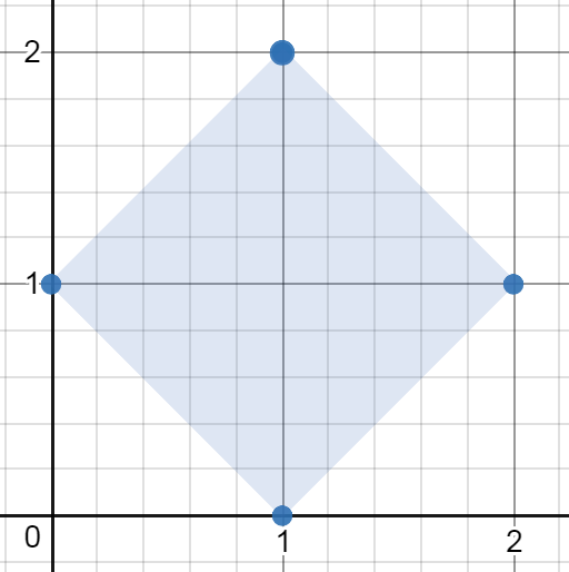 Explanation: The minimum area rectangle occurs at [1,2],[2,1],[1,0],[0,1], with an area of 2.
