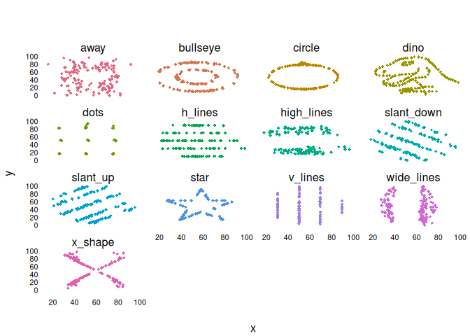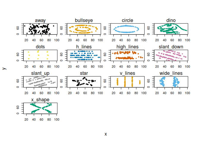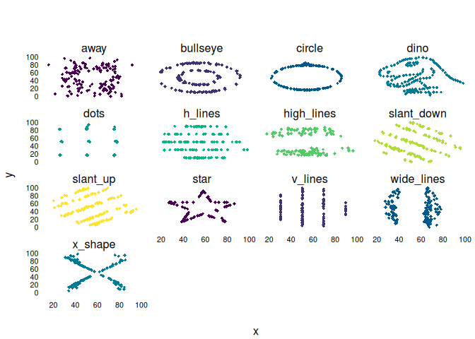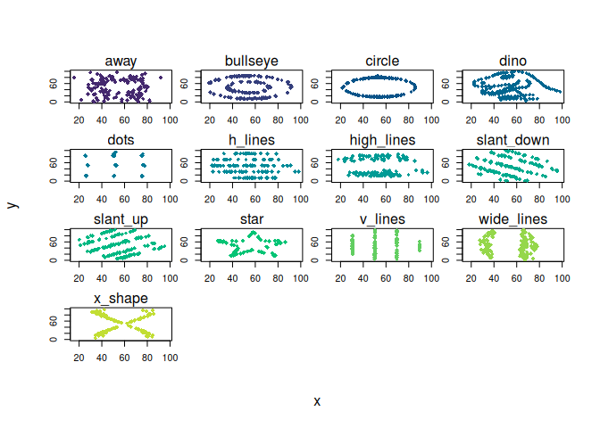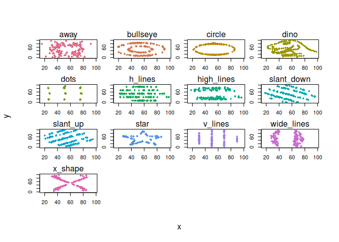 ddplot = function(...) plt(y ~ x | dataset, facet = "by", data = datasauRus::datasaurus_dozen, pch = 18, legend = FALSE, ...)