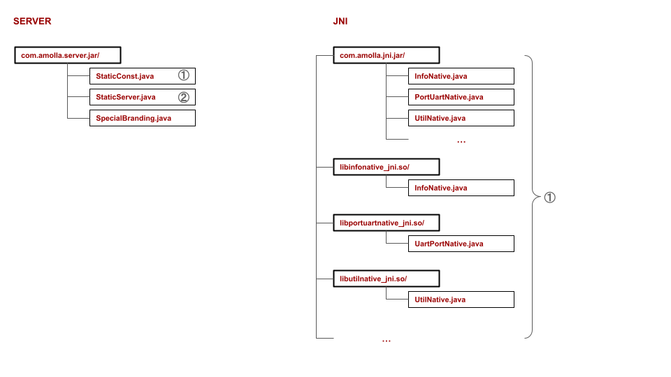 ① Java 파일은 한개의 cpp 파일과 연결되어 있습니다. 큰 범주 밑의 각 폴더들은 각기 하나의 라이브러리로 빌드됩니다. 각 so 라이브러리들은 Java 파일에서 Load 되며 JNI가 필요하지 않다면 구현하지 않습니다. 서비스들의 큰 범주의 폴더 이름을 여기 사용하여 가독성을 높입니다. 앱으로 제작되는 경우나 Android 9+ 버전에서의 개발을 위하여 Old Style JNI 를 사용합니다.