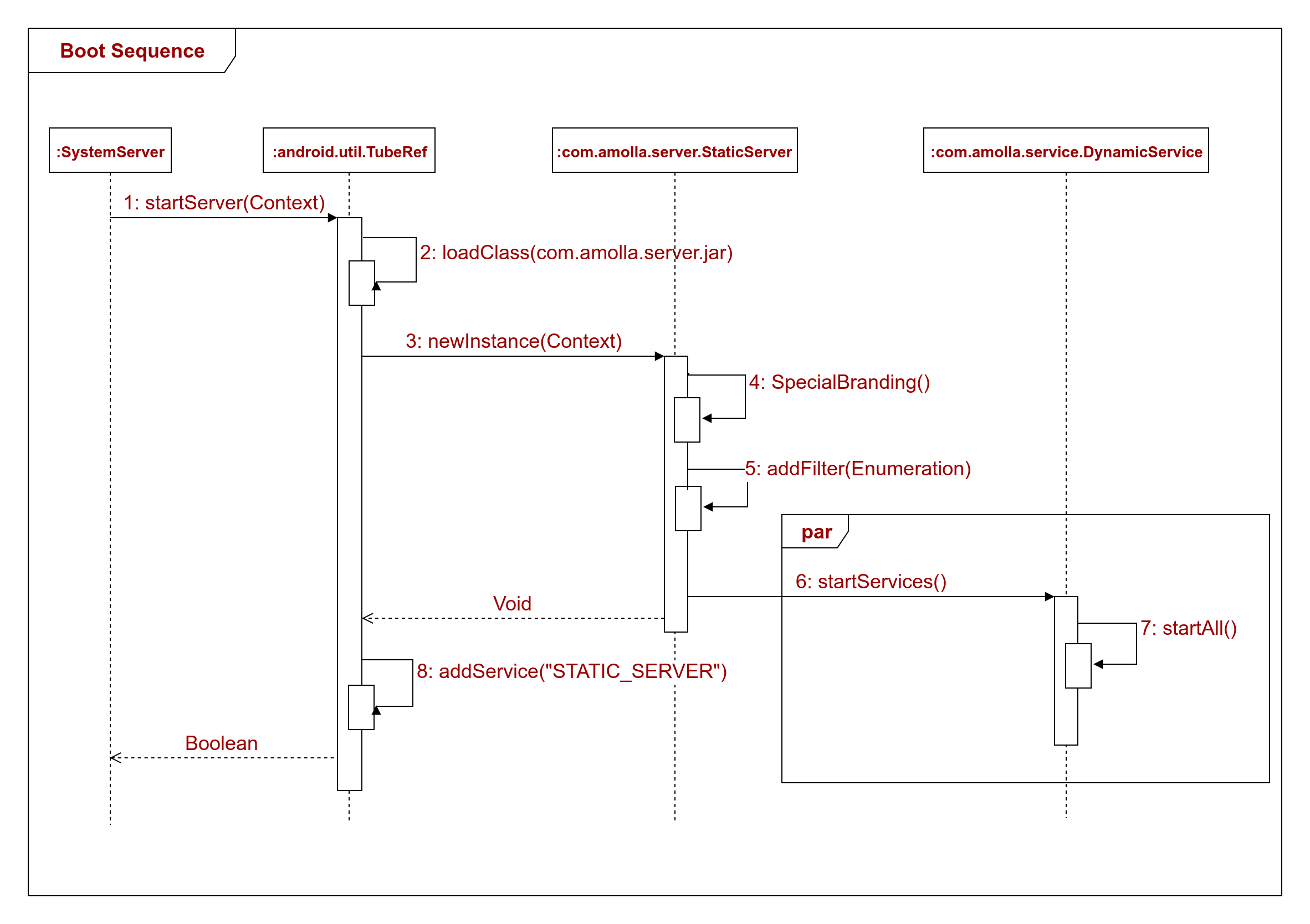 AOSP의 SystemServer에서 com.amolla.server.StaticServer를 시작합니다. Java reflection으로 com.amolla.server.jar를 Load 합니다. 객체를 생성한 후, 생성자에서 서비스 구동을 위한 여러 설정 작업을 진행합니다. (IntentFilter 등록)