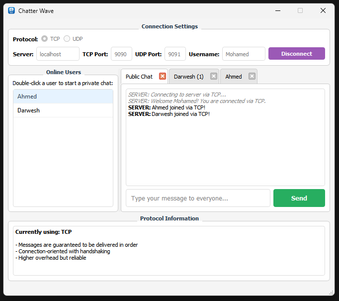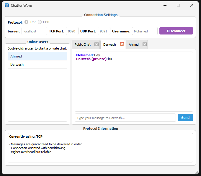 A cross-platform chat application built with PyQt5 supporting both TCP and UDP protocols for network communication.