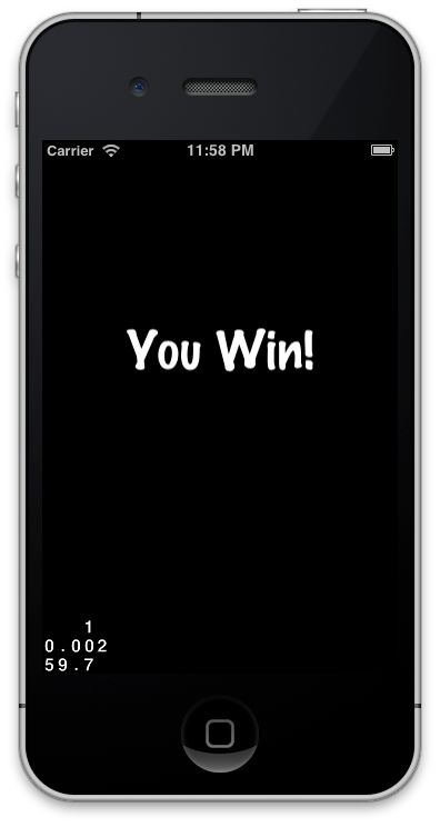 We'll need a new Scene (and Layer) to represent winning the game. It's going to be really simple: just the words "You Win!" in big letters in the middle of the screen. It's been a while since we've created a Layer, but it's pretty straightforward: