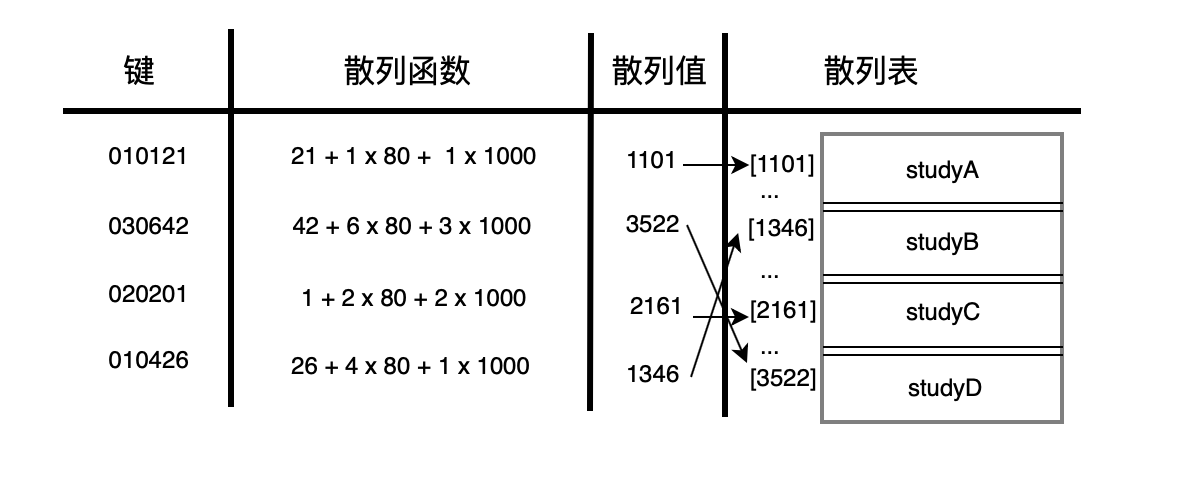 这就是散列! 通过给定的学号,去访问一种转换算法(将学号010121转换为1年级,1 班,21号的方法),得到对应的学生所在地址(1年级,1 班,21号)。