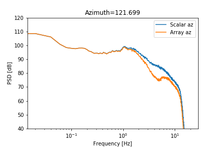 I realized that when plotting the spectrum of both, where the input of an azimuth array causes a dip in the spectrum at 2-5 Hz. An example plot is shown below.